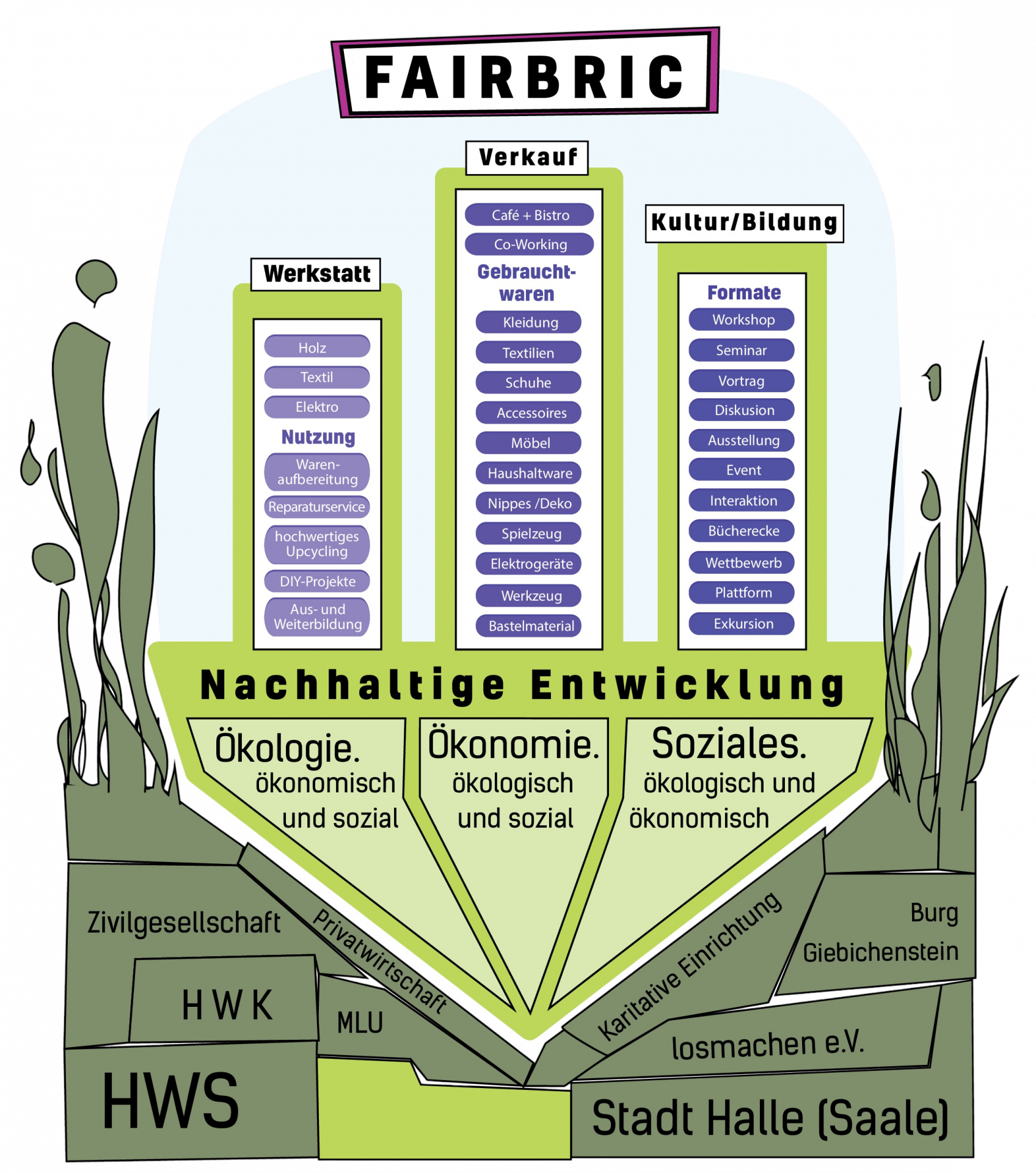 Der losmachen e.V. plant den Aufbau der FAIRBRIC in Halle – ein vielseitiges soziokulturelles Zentrum, das einen aktiven Beitrag zur nachhaltigen Entwicklung der Stadt leisten wird. Wir sind überzeugt, dass Ressourcenschutz, Kreislaufwirtschaft sowie die notwendige sozial-ökologische Transformation der Stadt, eine Aufgabe für die gesamte Gesellschaft ist.