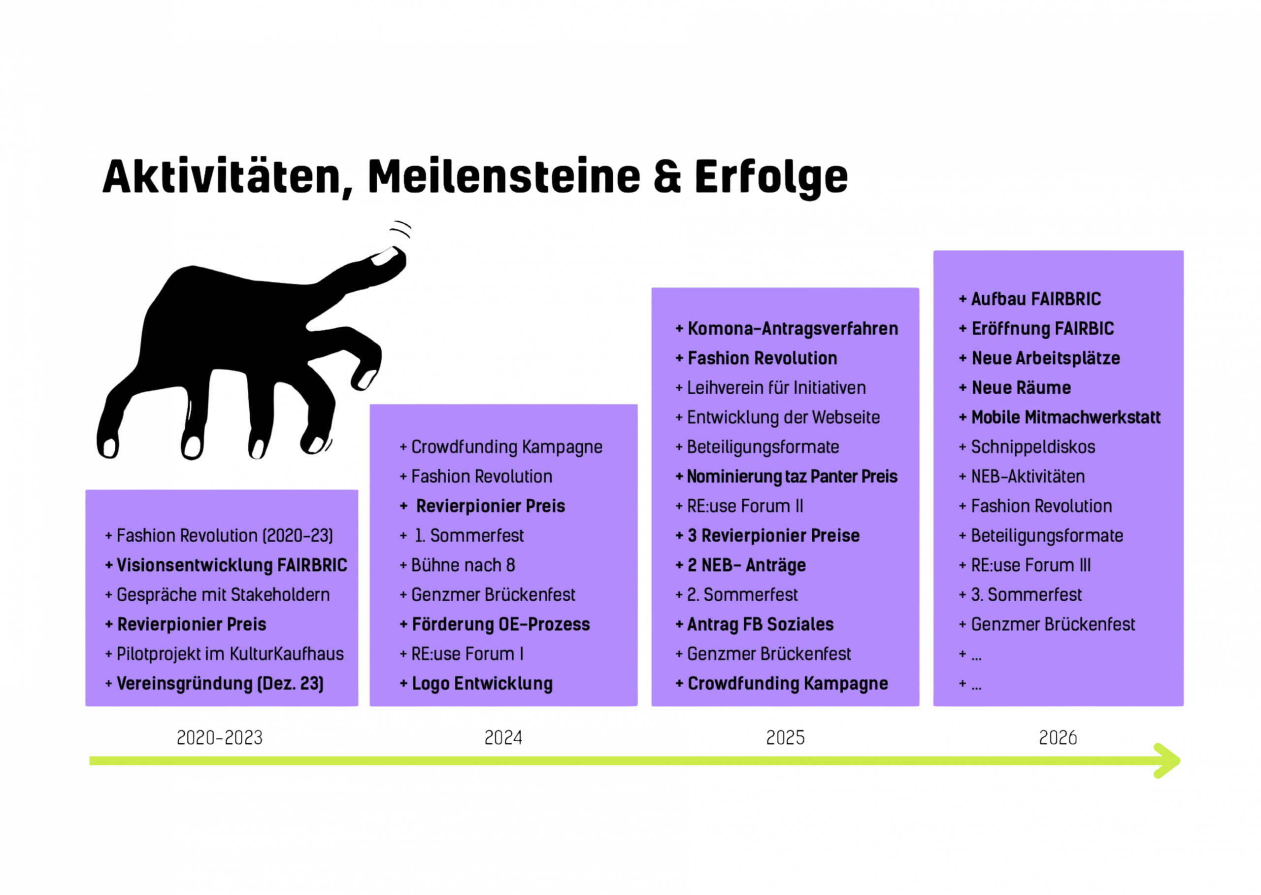 Unser Ziel ist es gemeinschaftlich einen zentral gelegenen Ort zu schaffen, der von vielen Schultern getragen und gesamtgesellschaftlich belebt und genutzt wird. In unserer Vision ist die FAIRBRIC ein interaktives Zentrum für nachhaltigen Entwicklung. Es vereint ein Gebrauchtwaren-Kaufhaus, offenen Werkstätten sowie ein vielfältiges Angebot an Bildungs- und Kulturveranstaltungen. Die 17 Nachhaltigkeitsziele (SDGs) der Agenda 2030 sind unsere Grundwerte und somit sozial, ökologisch und ökonomisch handlungsleitend.